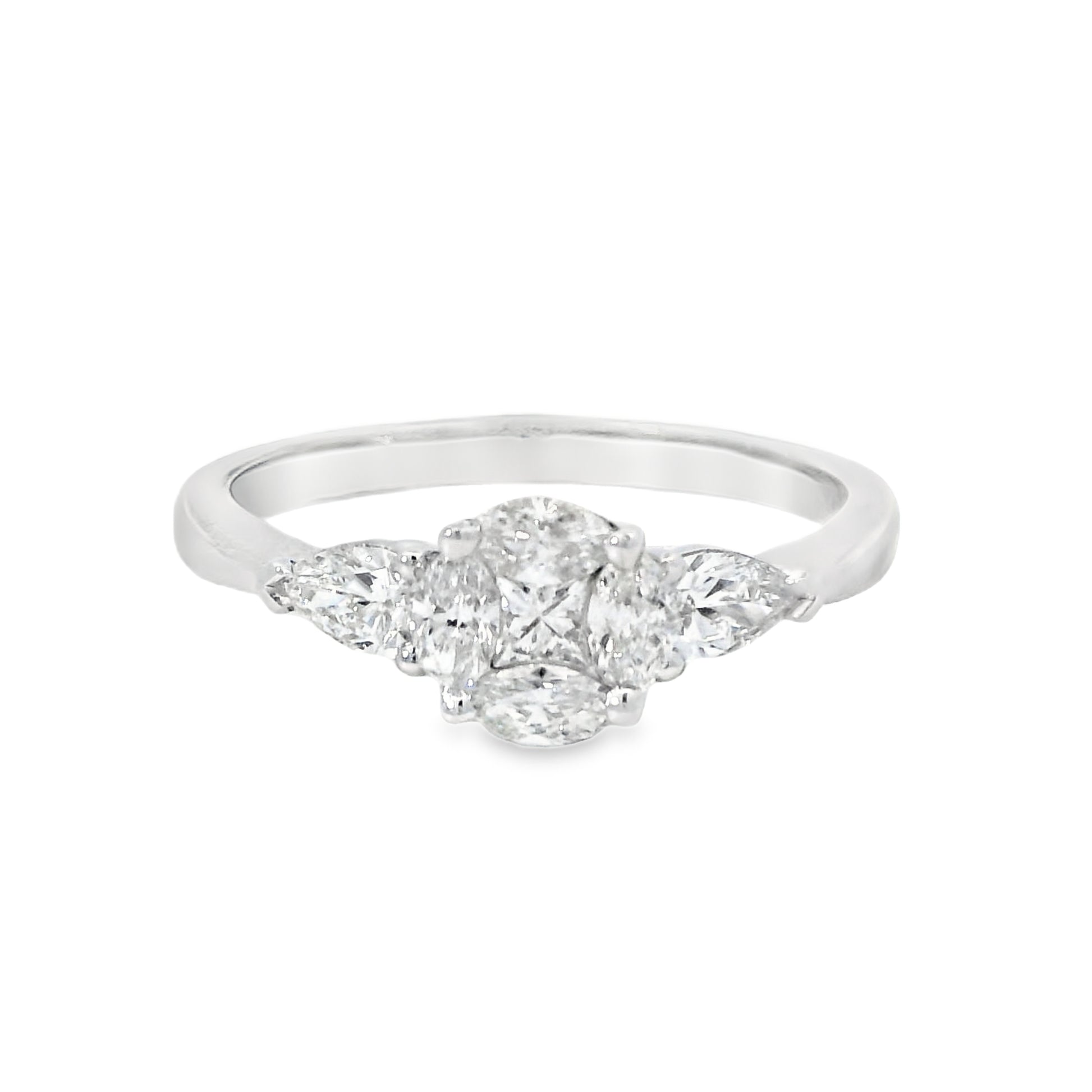 Experience the epitome of elegance with this captivating 18ct white gold diamond cluster ring. Showcasing a sumptuous blend of marquise and pear-cut diamonds, together weighing 0.69ct, this ring is a visual feast. The artful arrangement of these diamonds offers a unique blend of elongated and teardrop shapes, exuding both contemporary charm and timeless sophistication.